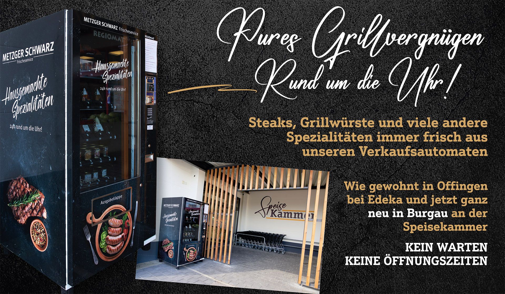 Auf dem Edeka-Parkplatz in Offingen und am Eingang der Speisekammer in Burgau finden Sie Steaks, Grillwürste und viele andere Spezialitäten aus unserem Hause im Verkaufsautomat.